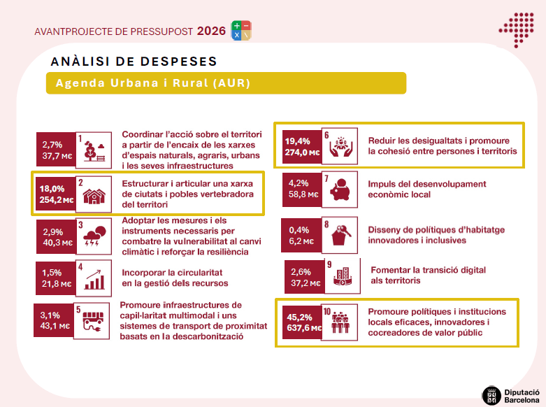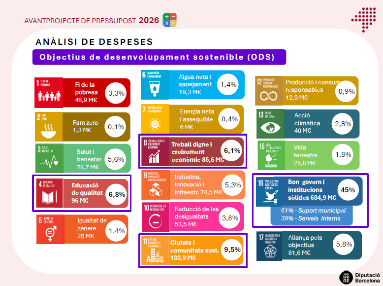 També es mostra la presentació de l'avanprojecte de pressupost de l'any 2026 que incorpora un resum del pressupost de l'any 2026, classificat per ingressos i despeses, i la seva vinculació amb els objectius de desenvolupament sostenible (ODS) i les despeses per l'Agenda Urbana Rural (AUR):