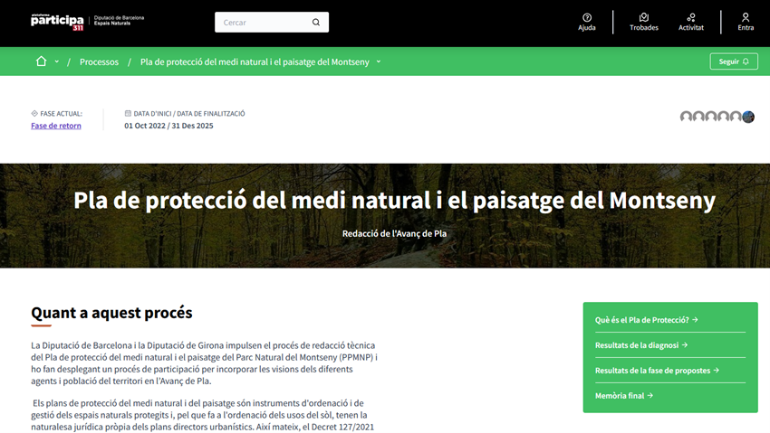 L’Oficina Tècnica de Participació per als Governs Locals de la Diputació de Barcelona també ha treballat, a nivell intern, amb l'Àrea d'Infraestructures i Espais Naturals, en col·laboració amb la Diputació de Girona, per a portar a terme un procés participatiu per al Pla de Protecció del medi natural i el paisatge del Montseny. Podeu conèixer tots els detalls i les fases del procés accedint a la plataforma Participa311 del projecte.